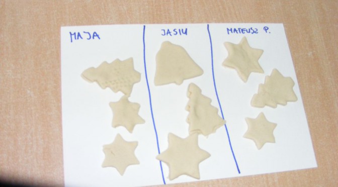 Dziś Biedronki samodzielnie wykonywały ozdoby świąteczne. Swoją rękodzielniczą przygodę rozpoczęliśmy od zapoznania się z symboliką świąt i ozdób świątecznych. Dzieci dzielnie wałkowały i wycinały ozdoby z masy solnej. Teraz czekamy na przeschnięcie i będziemy je ozdabiać 😉 Wykorzystaliśmy też niekompletne puzzle do stworzenia ciekawych zawieszek. Zapraszamy do Albumu.
