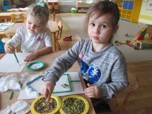 elementów karmniki dla ptaków. Na początku układaliśmy z piankowych patyczków kształt karmnika. Później przyklejaliśmy je na kartkę papieru. Następnie wypychaliśmy i przyklejaliśmy ptaszka w karmniku. Później uzupełnialiśmy naszą kompozycję o pozostałe elementy: przyklejaliśmy watę na daszek oraz ziarenka do naszej ptasiej stołówki. Biedroneczki z zaangażowaniem wykonywały pracę plastyczną – małe dzieła można zobaczyć a naszej przedszkolnej galerii, a tymczasem zapraszamy do Albumu.