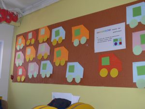 Biedronki zainspirowane wierszykiem ruszyły do salki, w której znajduje się tablica interaktywna i rysowały na niej różne figury geometryczne, potem obejrzały filmik edukacyjny, który również był o figurach. Następnie wróciły do sali i stworzyły samochodziki z prostokątów, kwadratów i kółek. Zapraszamy do Albumu.