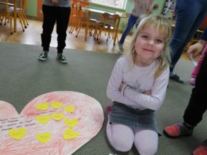 dlaczego warto być życzliwym i jak okazywać życzliwość na co dzień. Była to wspaniała okazja do przypomnienia „magicznych słów”, w czym pomogły nam zabawne wierszyki. Wysłuchaliśmy opowiadania „O zaczarowanym flecie”, które utrwaliło nam zasady dobrego zachowania się. Na zakończenie każdy z nas wykonał swoje „Serduszko życzliwości”. Z naszych prac powstał piękny plakat, który będzie nam przypominał, jak należy zachowywać się wobec innych. Następnie wyruszyliśmy na spacer, podczas którego wręczaliśmy ordery życzliwości napotkanym osoba. Był to moment, w którym przypominaliśmy wszystkim, że warto być życzliwym 🙂