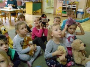 Sówki przyniosły dziś do przedszkola swoje ukochane misie. Zajęcia