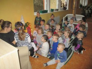 Dziś odwiedziła nas Pani Muzyka z fantastycznym przedstawieniem o przygodach małego słonika. Zwierzak miał kłopot, bo urodził się z plamką na grzbiecie i wszystkie zwierzęta mu dokuczały. Postanowił więc wybrać się do pradziada Mamuta, aby ten pomógł mu coś z tym fantem zrobić 🙂 W rytm wesołych