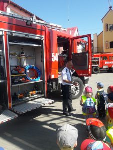 Pożarnej w Gniewie. Na miejscu zostaliśmy bardzo mile przyjęci. Strażacy opowiedzieli nam o swojej pracy. Mogliśmy zobaczyć na własne oczy mundury oraz sprzęt strażacki. Następnie samodzielnie gasiliśmy pożar! Jednak największą atrakcją była przejażdżka prawdziwym wozem strażackim. Dziękujemy bardzo skarbnikowi naszej grupy Pani Barbarze za pozyskanie sponsora, który zapłacił za przewóz Misiów 🙂 Radość dzieci – bezcenna 🙂 Zapraszamy do Albumu.