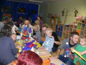 „Podróże male i duże” odbyły się warsztaty plastyczne, podczas których dzieci wraz z rodzicami wykonywały rakiety kosmiczne z różnych materiałów pochodzących z recyklingu i nie tylko. Dzięki udekorowanej sali przenieśliśmy się