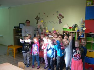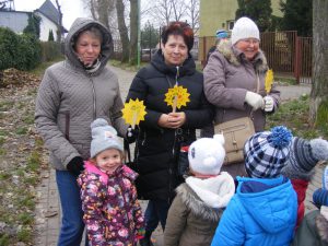 Z tej okazji wszystkie maluchy rozmawiały o tym, że trzeba być wobec siebie miłym i przyjaznym, staraliśmy się nie spierać o zabawki 🙂 (choć było to trudne), a ponadto postanowiliśmy o tym wspaniałym dniu opowiedzieć innym 🙂 Przedszkolaki przygotowały specjalne znaczki na patyczku oraz medale na wstążeczkach i wyruszyły 'w miasto’, obdarowując przechodniów wykonanymi własnoręcznie słoneczkami i oczywiście swoimi uśmiechami 🙂 Mamy nadzieję, że ta dawka pozytywnej energii