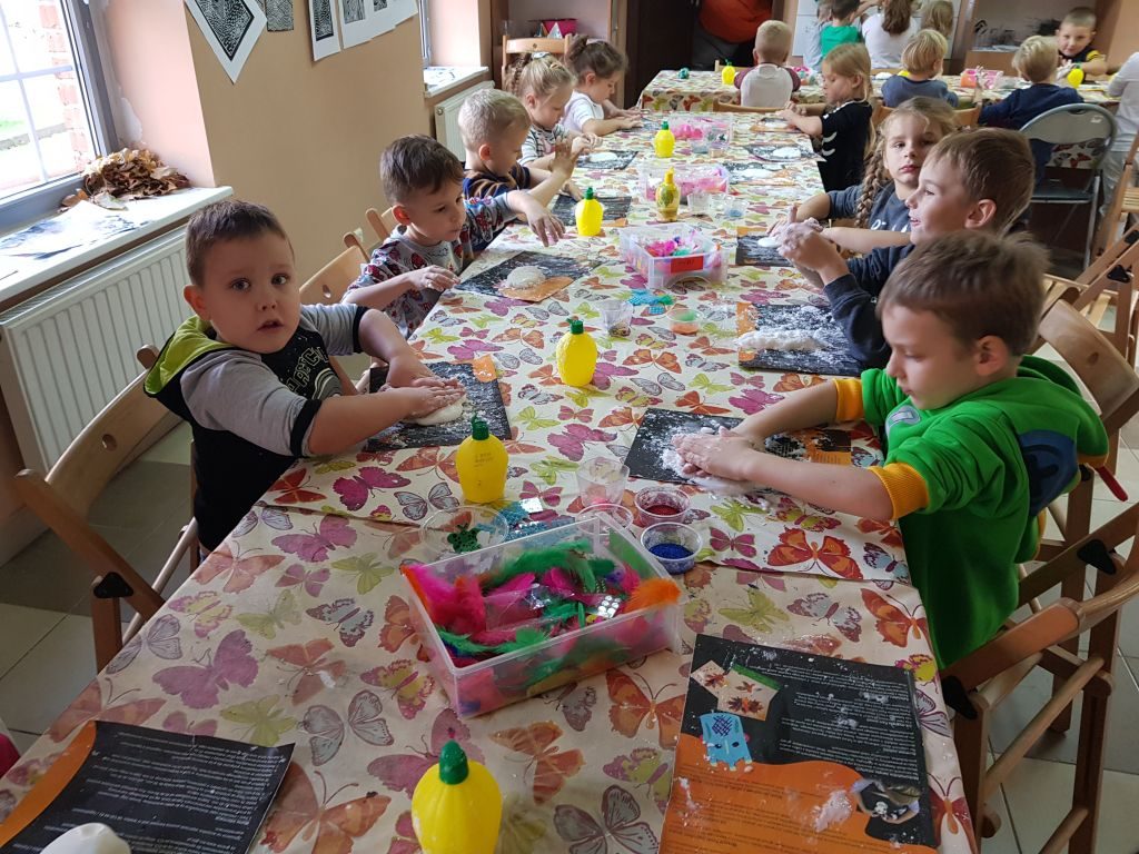 W piątek 25 października dzieci z grupy Tygryski odwiedziły Fabrykę Sztuk i wzięły udział w warsztatach „Meksykańskie święto zmarłych”. Efektem były przepiękne kolorowe dzieła sztuki wykonane z cukru pudru i kwasku cytrynowego 🙂 Dzieciom bardzo się podobało ugniatanie masy, a zwłaszcza to, że meksykańskie maski są kolorowe i można używać dużo brokatu 🙂 Zapraszamy do Albumu.