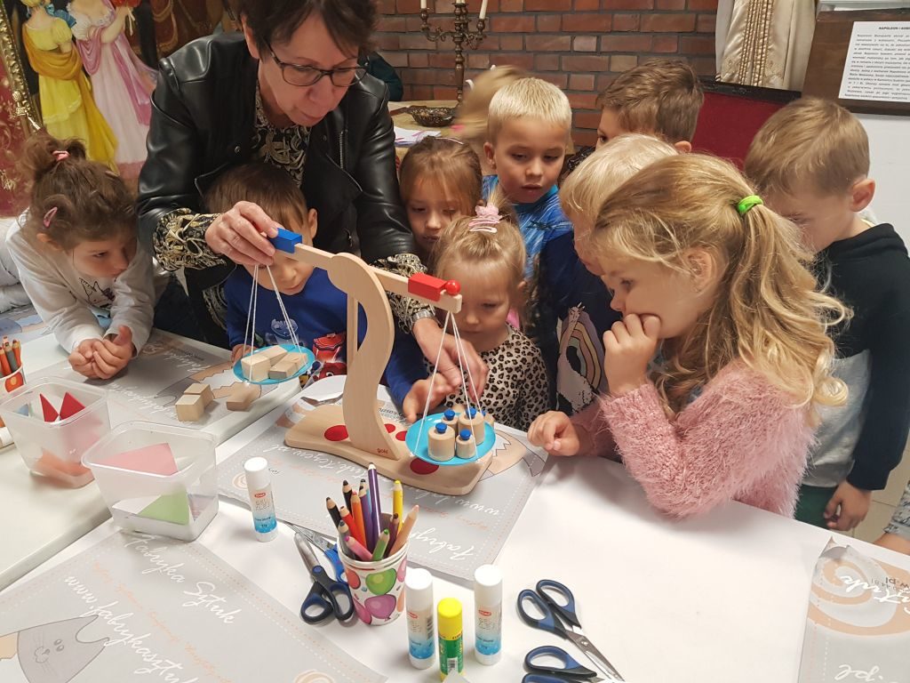 Dnia 18 września dzieci z grupy Tygryski udały się do Fabryki Sztuk, aby wziąć udział w warsztatach połączonych z obejrzeniem wystawy „Jak dawniej mierzono”. Dzieci miały okazję porównać wagę różnych przedmiotów, samodzielnie ustawiać odważniki, sprawdzać, jak zmienia się waga po dodaniu większej ilości cukierków. Dzieci wykonały również pracę plastyczną: swoją własną wagę. To było bardzo ciekawe spotkanie 🙂 Zapraszamy do Albumu.