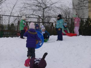 Tegoroczna zima płata nam figle, raz jest ciepło, a raz mroźno. Dlatego korzystając z jej uroku, postanowiliśmy pobawić się na śniegu w naszym przedszkolnym ogrodzie. Dzieci oddały się zimowemu szaleństwu, zjeżdżając na jabłuszkach, rzucając śnieżkami do siebie, a także „atakując” kulami śniegowymi swoje panie (oczywiście zachowując zasady bezpieczeństwa). Pogoda była trochę mroźna, ale nikomu to nie przeszkadzało, bo dzieci wiedzą, że zabawy na świeżym powietrzu to świetna rozrywka oraz świetny zimowy sport hartujący i wzmacniający organizm 🙂 . Z czerwonymi noskami i z uśmiechami wróciliśmy do przedszkola na ciepłą zupkę. Było mroźnie, ale wesoło i radośnie. Zapraszamy do Albumu.