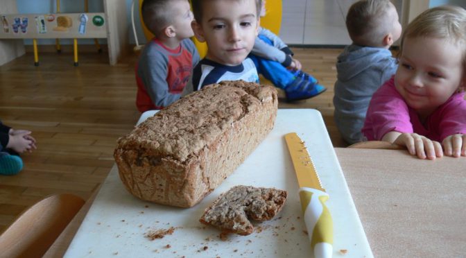 Biedroneczki na zajęciach dowiedziały się, jakie są etapy powstawania chleba oraz kto pracuje przy jego produkcji. Następnie odwiedziła nas Pani Asia – Babcia Jasia i zaprosiła nas do wspólnego wykonania chleba. Prezentowała składniki, które są nam potrzebne i za pomocą specjalnego urządzenia wykonała ciasto, które później musiało wygrzać się na słoneczku i wyrosnąć. Następnie dzieci zaniosły chlebek do Pani Kucharki i poprosiły, aby im go upiekła w piecu 😉 I nawet mogły przez chwilkę to pieczenie obserwować 🙂 Zapach chlebka było czuć w całym przedszkolu, a wypiek wyszedł naprawdę pyszny 🙂 Zapraszamy do Albumu.