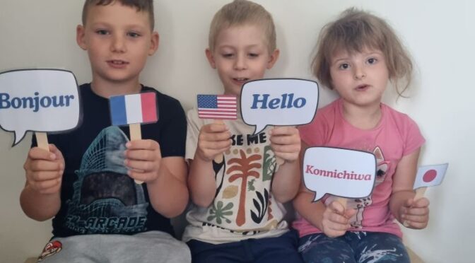 W ostatnich dniach wzbogaciliśmy nasze zajęcia języka angielskiego o elementy wiedzy o innych krajach. Poznaliśmy nazwy wybranych państw, opisywaliśmy ich flagi, a także nauczyliśmy się przywitań w różnych językach 🙂 A wszystko to z okazji Dnia Języków Obcych.