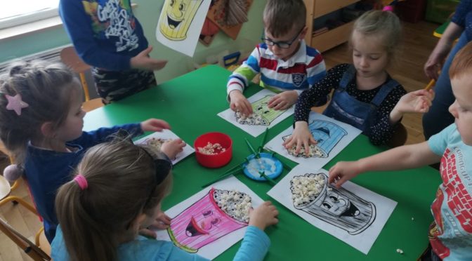 Sówki, Misie i Kotki obchodziły Dzień Popcornu. Z okazji tego dnia dowiedział się, jak i z czego powstaje popcorn. Wykonały popcornową pracę plastyczna. Panie przygotowały również super fotobudkę oraz popcornowy poczęstunek 🙂 Zapraszamy do Albumu.
