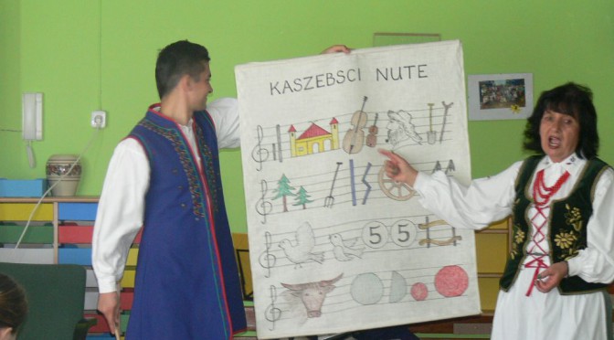 Pani Muzyka przywiozła dziś do nas kaszubską kulturę – piękne kaszubskie stroje i instrumenty. Szczególnie zaciekawiły dzieci 'diabelskie skrzypce’, ale jakoś nikt się nie bał tego instrumentu. Przedszkolaki usłyszały piosenki w języku kaszubskim , hymn Kaszub a także znane przeboje, np 'Yesterday’. Uczyły się także ciekawie brzmiących słów w tym języku.