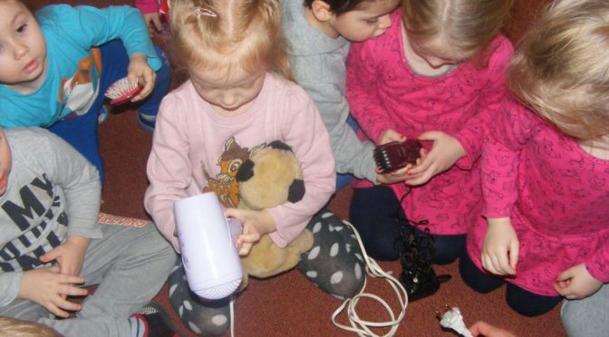 Na początku zajęć nazywaliśmy poszczególne przybory takie jak: nożyczki, suszarka, szczotka, grzebień, maszynka do włosów, szampon, lokówka, lakier do włosów. Następnie określaliśmy do czego są one potrzebne w pracy fryzjerowi. Później mogliśmy obejrzeć je z bliska, a suszarkę i maszynkę do włosów nawet usłyszeć 🙂
