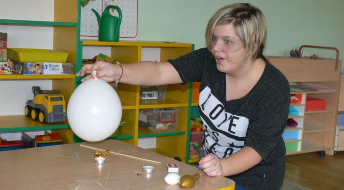 Miss Beata zaprezentowała nam eksperymenty : „Czego potrzebuje ogień?”, „Pęknie czy nie pęknie?”, „Balon na patyku”, „Balonowa rakieta”.