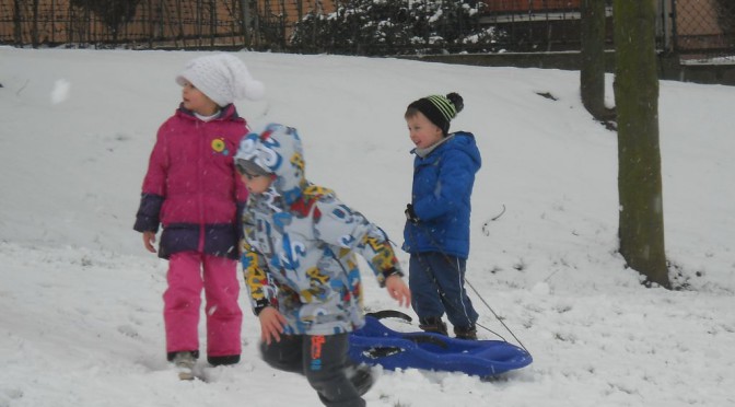 Krasnale postanowiły tym razem przywitać zimę w przedszkolnym ogrodzie. Wyposażeni w ubrania arktyczne oraz sprzęt zjazdowy wyruszyli na śnieżną wyprawę. Były nawet próby ulepienia bałwana 😉 Zapraszamy do Albumu.DSCN7375