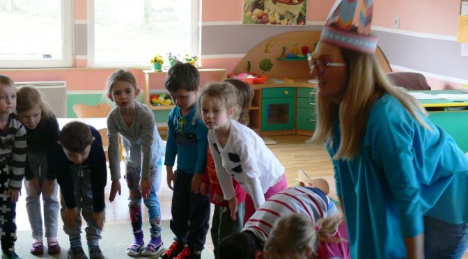 wymyślając indiańskie okrzyki, podczas naśladowania min małej Indianki i wykonując ćwiczenia zawarte w opowiadaniu „Indiańskie plemię Tiki-Taka”. Na koniec wszyscy w rytm indiańskiej muzyki zatańczyli taniec wywoływania deszczu – i udało się: po południu spadł deszcz 🙂 Zapraszamy do Albumu.