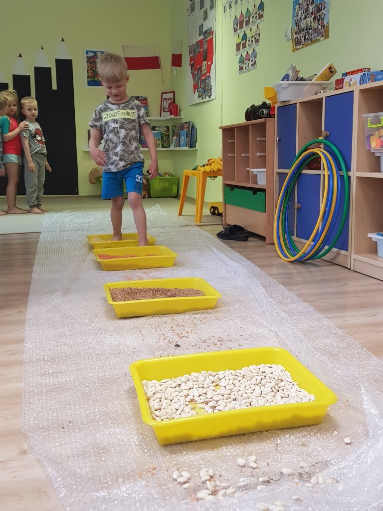 Tym razem gimnastyka Misiów zakończyła się niespodzianką. Dzieci miały okazję chodzić po dywanie sensorycznym przygotowanym przez Panie. Bosymi stopami chodziły po fasoli, grochu, kaszy itp. 🙂 Zabawa była bardzo udana, dzieci były zachwycone 🙂 Zapraszamy do Albumu.
