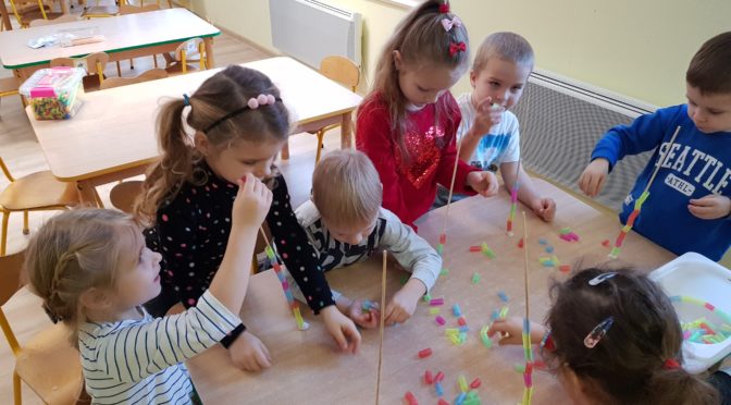 Misie również wykorzystały słomki do różnych zabaw w sali. Wykonywały przy tym ćwiczenia oddechowe, nawlekały kawałki słomek na patyki na czas, robiły bańki mydlane oraz budowały ciekawe budowle przestrzenne, które nazwały wymarzonym placem zabaw w przedszkolu 🙂