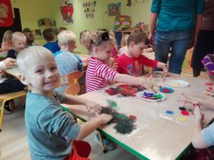 uwrażliwia na bodźce i dotyk, uczy poznawania faktur, udoskonala sprawności manualne, pozwala na twórczą ekspresję w formie plastycznej, uwalnia od zahamowań, daje poczucie swobody i wolności, uwalnia od oporu emocjonalnego związanego z brudzeniem rąk, rozluźnia mięśnie, działa uspokajająco i wyciszająco, uczy kolorów i sposobów ich powstawania poprzez mieszanie barw 🙂 Misie malowały paluszkami, słuchając jednocześnie muzyki. Określały nastrój, który towarzyszył im podczas słuchania różnych utworów. Dzieci były zachwycone 😉 Zapraszamy do Albumu.