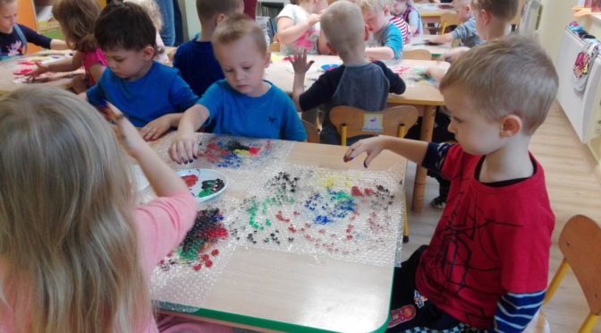 Malowanie 10 paluszkami na folii bąbelkowej to świetna zabawa plastyczno-sensoryczna. Pozwala przeżyć wrażenia dotykowe,