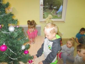 Dziś nasze Misiaki zabrały się za ubieranie choinki. Każdy powiesił swoją ulubioną ozdobę, dzięki czemu choinka wygląda naprawdę wyjątkowo! Wiszą na niej bombki, łańcuchy i oczywiście nie mogło zabraknąć lampek, których blask witał nas od progu przedszkola. Zapraszamy do Albumu.