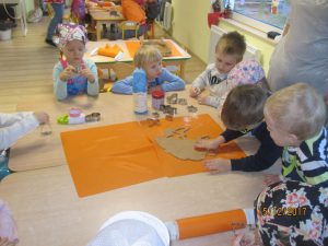 przypraw. Dzień ten był bardzo pracowity, bowiem tego dnia Misiaki piekły pierniczki. Najpierw odpowiednio się przygotowały, dbając o czyste rączki oraz zakładając fartuszki. Poznały też składniki i sposób wykonania ciasta, potrzebne przybory kuchenne, a także zasady bezpieczeństwa. Gdy wszystko było gotowe, przedszkolaki z ogromnym zapałem i zaangażowaniem zabrały się do pracy: wałkowały ciasto i wykrawały ciasteczka. Efektem naszej pracy były pełne blaszki pierniczków, które zanieśliśmy do kuchni. Tu pod