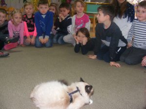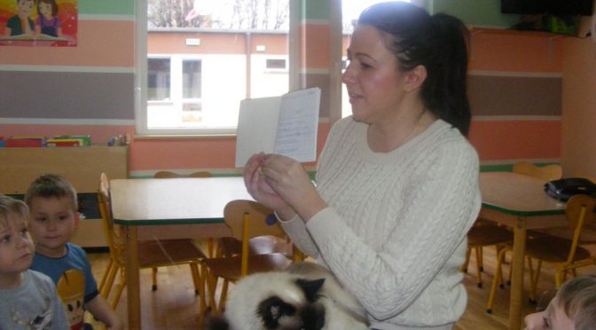 W czwartek 26 stycznia do przedszkola zawitał specjalny gość – kotek Fifi. Pani Magda, mama Konrada, opowiedziała nam o kocich zwyczajach. Dowiedzieliśmy się o ulubionych przysmakach, o pielęgnacji kota i o różnych rasach kotów. Okazało się, że Fifi to rasowy kot, który ma swój rodowód. Wiemy też, co zrobić, gdy nasz pupilek zachoruje. Każdy z nas mógł pogłaskać Fifi, która była chyba bardzo zadowolona. Dziękujemy Pani Magdzie za lekcję o kotach i zapraszamy do Albumu.