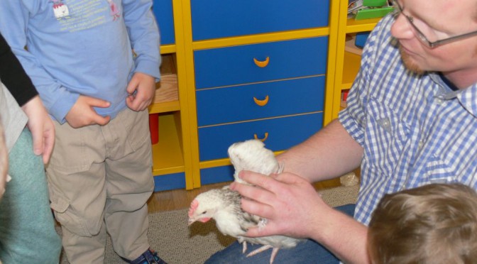 Z okazji nadchodzących Świąt Wielkanocnych u Biedroneczek pojawił się niecodzienny gość – żywy kurczak. Przedszkolaki mogły zobaczyć i pogłaskać kurczaka z bliska 😉