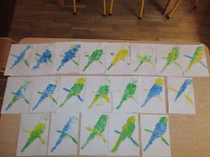 Potem bawiliśmy się w zabawy, w których to my wcieliliśmy się w papużki?To jeszcze nie koniec: mieliśmy bowiem możliwość wykonania własnych papużek falistych. Przy pomocy farby robiliśmy stempelki z paluszków, wypełniając kontury szkicu ptaszka i tworząc różnobarwne upierzenie. To był ciekawy dzień. Zapraszamy do Albumu.