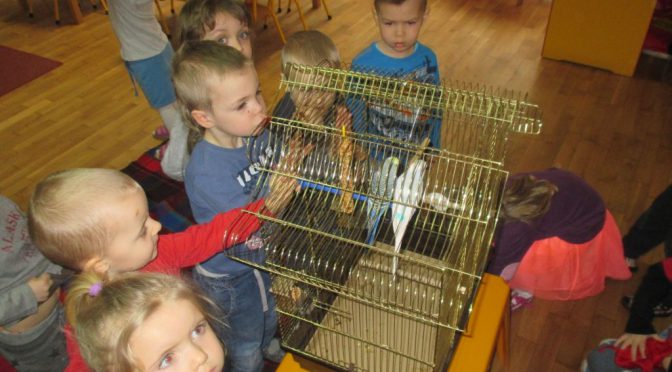 W czwartek 30.03.2017 r. grupę Kotków odwiedzili niezwykli goście – dwie papużki faliste Kasia i Edek. Pani Alicja opowiedziała nam o tych egzotycznych ptaszkach, poznaliśmy też wyposażenie klatki papugi, a także dowiedzieliśmy się, jak powinniśmy dbać o ptaszki, kiedy zdecydujemy się na ich hodowlę w domu. To bardzo odpowiedzialne zadanie.