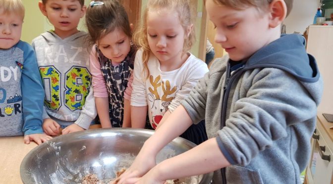 W poniedziałek Misiaki wykonały kolejne zadanie z naszego kalendarza: upiekły pierniczki. Wszystkie dzieci umyły rączki i chętnie brały udział ugniataniu ciasta, same wybierały kształty foremek. Kiedy już wszystkie pierniczki były gotowe, Pani Iwonka zaniosła je do kuchni. Po chwili w całym przedszkolu unosił się piękny zapach naszych wypieków 🙂 Zapraszamy do Albumu.