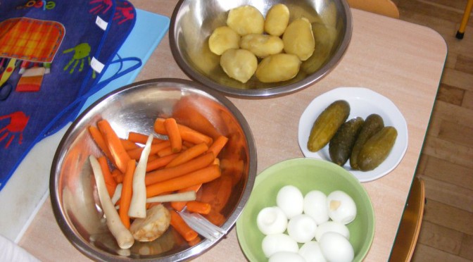 ,,Na zdrowie” – postanowiliśmy zrobić wspólnie pyszną sałatkę warzywną. Przy tej okazji przypomnieliśmy sobie wygląd, smak i zapach niektórych składników.Każdy dostał tackę, nożyk i tak przystąpiliśmy do krojenia. Dzieci samodzielnie kroiły i przyrządzały sałatkę warzywną przestrzegając
