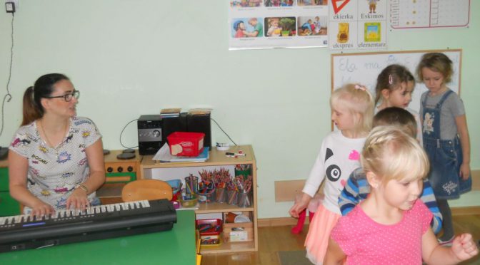 Pani Agata od umuzykalnienia zadomowiła się już na dobre w naszym Przedszkolu 🙂 Na ostatnich zajęciach przedszkolaki ćwiczyły maszerowanie w równych rytmach, zgadywały nastrój granej muzyki i musiały do niego dopasować minę 🙂 A z okazji zbliżającego się Święta Niepodległości posłuchały trochę piosenek patriotycznych. Zapraszamy do Albumu.