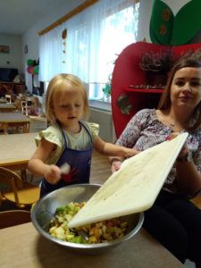 Na początku naszej warzywnej przygody zorganizowaliśmy sobie w naszej sali teatrzyk kukiełkowy z wiersza Jana Brzechwy „Na straganie”. Następnie – z myślą o jarzynowych witaminkach – grupa Kotków postanowiła zrobić wspólnie pyszną sałatkę warzywną. Przy tej okazji przedszkolaki poznały wygląd, smak i zapach niektórych składników. Każdy dostał tackę, nożyk i tak przystąpiliśmy do krojenia. Dzieci samodzielnie kroiły i przyrządzały sałatkę warzywną, przestrzegając zasad bezpieczeństwa przy posługiwaniu się nożem (plastikowym). Przyrządzanie sałatek dało dzieciom wiele satysfakcji. Zapraszamy do Albumu.