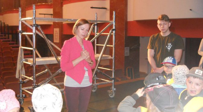 Sztuki, by poznać kulisy teatru. Pani Magda, która oprowadzała nas po domu kultury, zaprosiła dzieci na widownię i scenę. Mogliśmy poczuć się jak prawdziwi aktorzy. Zajrzeliśmy także do garderoby, by sprawdzić, w jaki sposób aktorzy przygotowują się do występu. Tam najbardziej podobało się dziewczynkom, które zachwycone były dużymi lustrami. Chłopcy zaś mieli okazję sprawdzić swoje umiejętności techniczne w dziale dźwięku i światła. Poznaliśmy słownictwo związane z teatrem. Wiemy co to scenografia, reżyserka, dekalog kulturalnego widza. Wycieczka bardzo nam się podobała. Warto czasem zajrzeć za kulisy! Zapraszamy do Albumu.