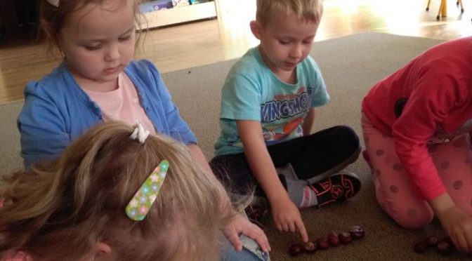 Dziś Sówki wykorzystały kasztany do zabaw matematycznych, słuchowych i orientacyjnych. Zajęcia w formie gier angażowały poznawczo dzieci, aktywizowały do samodzielnego działania, a przy okazji ukazywały umiejętności przedszkolaków z zakresu liczenia, spostrzegania słuchowego i wzrokowego, orientacji w schemacie własnego ciała (strona lewa i prawa) oraz umiejętnego współdziałania w grupie. Zapraszamy do Albumu.