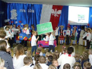 Polskę niepodległości. Dzieci zabrały nas w podróż autostopem po naszym kraju od Zakopanego do Gdańska. Słuchaliśmy wesołych piosenek, rymowanek i podziwialiśmy tańce 🙂 Przejeżdżaliśmy m.in. przez Kraków, Katowice, Żelazową Wolę, Warszawę, Toruń, Tczew i Gdańsk. Na zakończenie okazało się, że ktoś nam w Toruniu „wrzucił” do bagażnika pierniczki – wszystkie przedszkolaki mogły się nimi poczęstować 🙂 Przedstawianie rozpoczynaliśmy i kończyliśmy piękną piosenką o niepodległości – link poniżej. Popołudniowy pokaz dla rodziców również okazał się wielkim sukcesem, co potwierdzają wpisy zachwyconych rodziców w naszej kronice 🙂 Dziękujemy paniom Malwinie i Beacie za przygotowanie przedstawienia. Zapraszamy do Albumu.