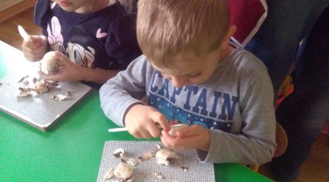 budowę i kolorystykę grzybów oraz przystąpiły same do zajęć praktycznych na pieczarce ( oglądały, oddzielały kapelusz od nóżki, kroiły, żeby zaobserwować budowę grzyba w środku) Zdobytą wiedzę wykorzystały w zabawie ruchowej „Grzybobranie”. Zapraszamy do Albumu.