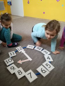 matematyczno-językowe: nauczyły się określać czas na zegarze 🙂 Choć szczęśliwi czasu nie liczą, to potrafimy już nazywać pełne godziny i zaznaczać je na tarczy zegara. Zrobiliśmy także autorskie zegary 🙂 Do tego poznaliśmy piosenkę Hickory Dickory Dock i różne zwierzątka w niej występujące. Tick Tock!