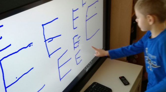 Wiemy już, że słoń to po angielsku Elephant i zaczyna się literką E, którą zapisaliśmy na tablicy interaktywnej.