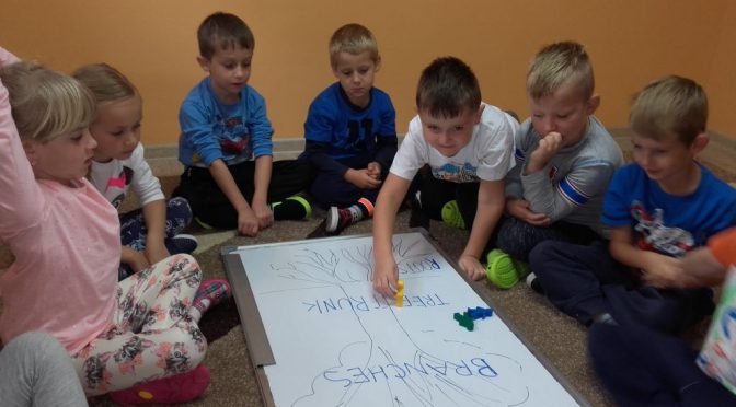 Co prawda Sówki, jeszcze nie czytają po angielsku, ale słuchają i uczą się rozróżniania słów. Czy Mrs Magda powiedziała TREE -drzewo? Czy może THREE – trzy. A potem dzieci ćwiczą wymowę. Dzisiaj poznały nowe słowa dotyczące drzewa: roots – korzenie, tree trunk – pień, branches – gałęzie i leaves – liście. Ćwiczymy też słuchanie ze zrozumieniem. Przedszkolaki słuchają już całych zdań!, starają się je zapamiętać i wykonać polecenie, np.The green man is jumping in the roots:) ; The yellow man is sleeping on a branch. Naprawdę świetnie już rozumieją co należy zrobić. GOOD JOB OWLS! Zapraszamy do Albumu.