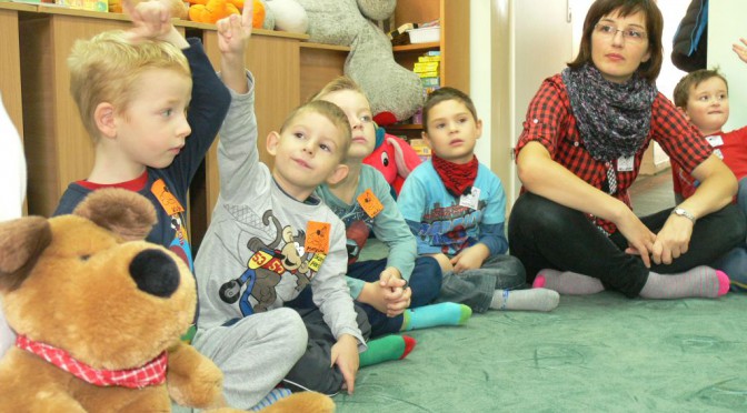 P1150661 P1150678Dziś Tygryski odwiedziły Bibliotekę i poznawały „Psie historie”. Dzieci wysłuchały wierszyka „Trzy psy przyszły” z łamańcami językowymi, rywalizowały w przyciąganiu kości, dowiedziały się co to jest dogoterapia. Jednym słowem dobrze się bawiły i sporo nauczyły.