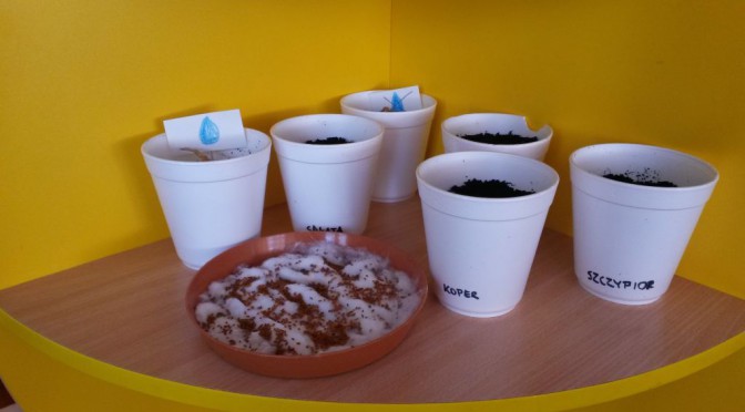 20150319_095310W tym tygodniu wcieliliśmy się w role ogrodników. Posialiśmy: rzeżuchę, koper, szczypior, pszenicę i sałatę. Posadziliśmy również dwie cebule: jedną z nich będziemy podlewać, drugiej nie, dzięki czemu sprawdzimy, czy woda jest niezbędna do tego, aby warzywo wypuściło szczypiorek. Na koniec każdego tygodnia wybieramy, na podstawie buziek- ocen zachowania, dwóch dyżurnych, którzy w następnym tygodniu będą dbać o nasz kącik przyrodniczy poprzez podlewanie roślin. Zapraszamy do Albumu.
