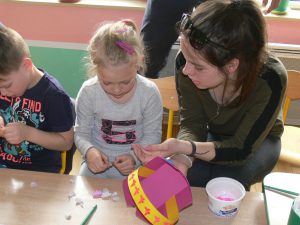 W poniedziałek Tygryski wraz z rodzicami zaczęły przygotowania do Świąt Wielkanocnych. Na warsztatach plastycznych ozdabialiśmy koszyki wielkanocne mając nadzieję, że przykica do nas zajączek. Mieliśmy piękne naklejki do przyklejania: biedronki, kwiatki, pszczółki. Efekt wyszedł niesamowity. Malowaliśmy również farbami gipsowego zajączka. Wszystkim praca sprawiła dużo radości. Dziękujemy rodzicom za przybycie i poświęcony dzieciom czas. Zapraszamy do Albumu.