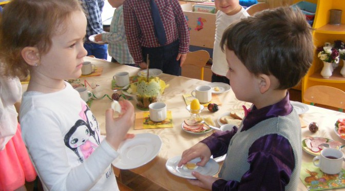 specjalny dzień. Odświętnie ubrane przedszkolaki zasiadły do Wielkanocnego śniadania. Przy pięknie udekorowanych stołach podzieliły się jajeczkiem, złożyły sobie nawzajem i paniom życzenia, a potem wspólnie zajadały świąteczne przysmaki.