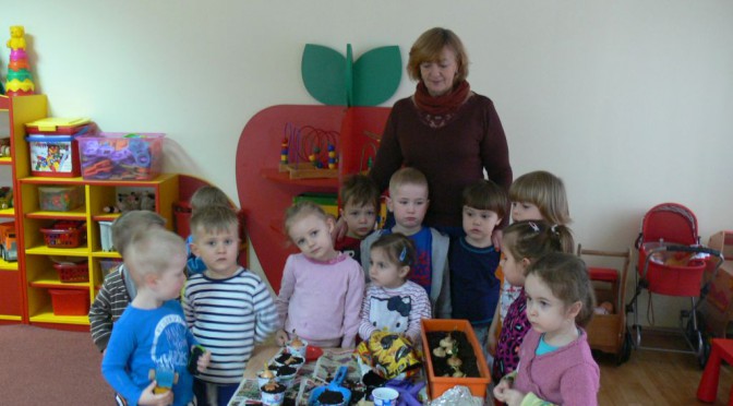 na parapecie wiosenny ogródek. Sadziły cebulkę do ziemi, poznały jej właściwości i zalety oraz bawiły się w kole przy piosence „Okrągła cebulka”. Ale i tak najfajniejsze było grzebanie w ziemi 😉 Będziemy z zaciekawieniem śledzić, co te cebulki w tej ziemi będą robić 😉 Zapraszamy do Albumu