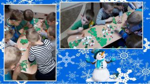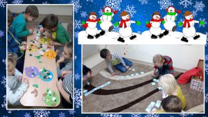 koordynację wzrokowo-ruchową bardzo podobały się dzieciom. Z wielkim zaangażowaniem wyszukiwały cienie pasujące do mikołajów i bałwanków oraz układały puzzlowe śnieżynki.
